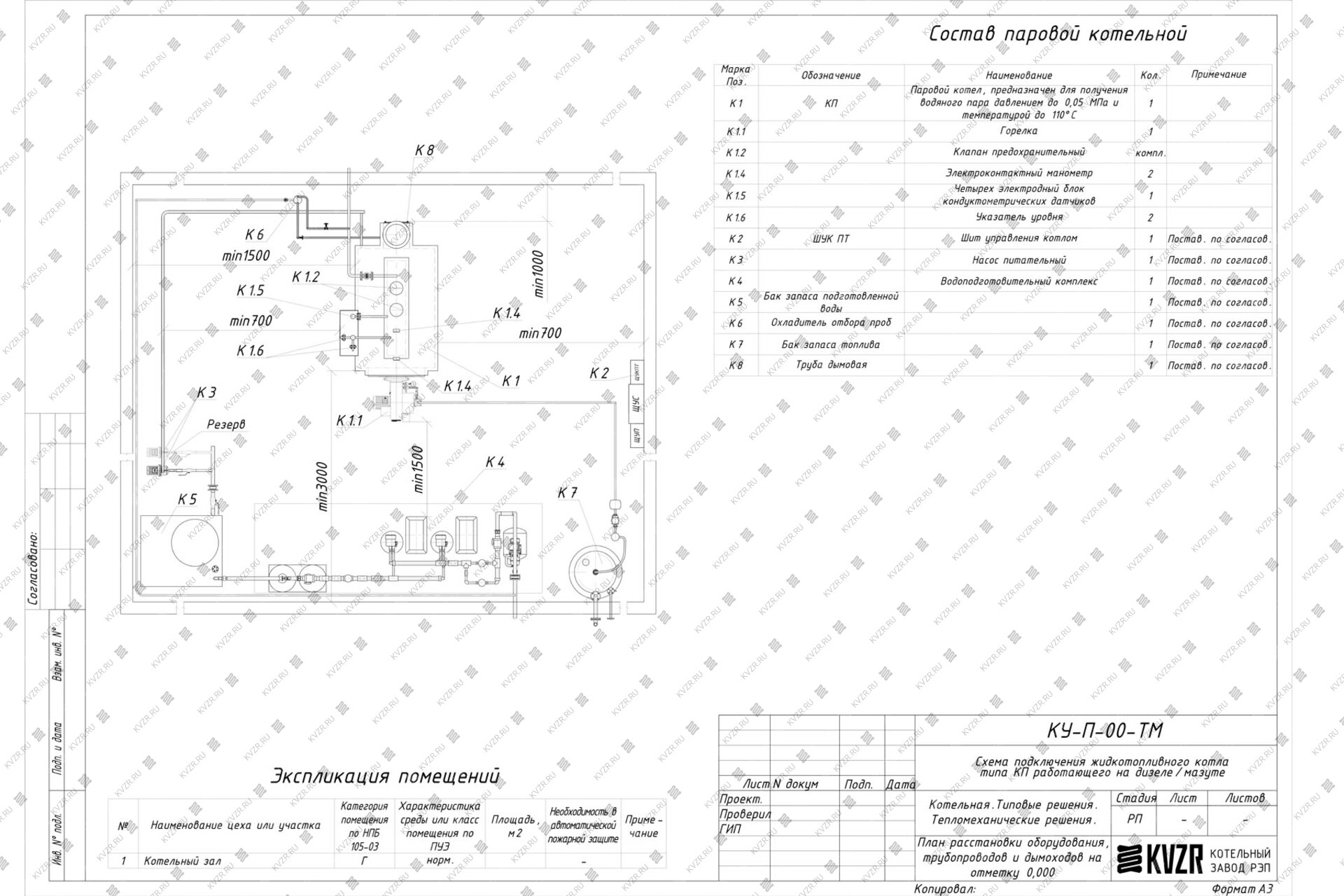 Чтобы правильно подключить дизельный паровой котел 700 кг / 0.7 т пара -115 °С -0,07 МПа / 0,7 кгс/cм² в котельной необходимо оставить проемы для обслуживания оборудования во время эксплуатации. На представленной здесь схеме обозначены их размеры. Кроме того, в данной примерной схеме монтажа паровых котлов и оборудования указан перечень минимально необходимого вспомогательного оборудования.