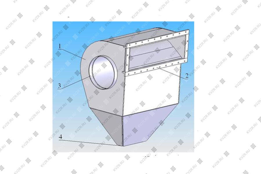Золоуловитель представляет собой корпус 1 с криволинейными стенками, соединенный с источником выброса дымовых газов фланцем прямоугольного сечения на входном отверстии 2 и круглым отверстием 3 на боковой стенке для отвода очищенного газа. Внизу корпуса имеется бункер-осадитель со спускным отверстием 4.