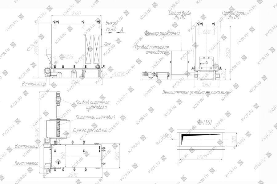 Из бункера топливо в агрегат подается шнековым питателем. Приводом питателя служит мотор редуктор. Для того, чтобы в шнековом питателе не возникло воспламенение топлива в конструкции предусмотрено воздушное охлаждение выходного узла.