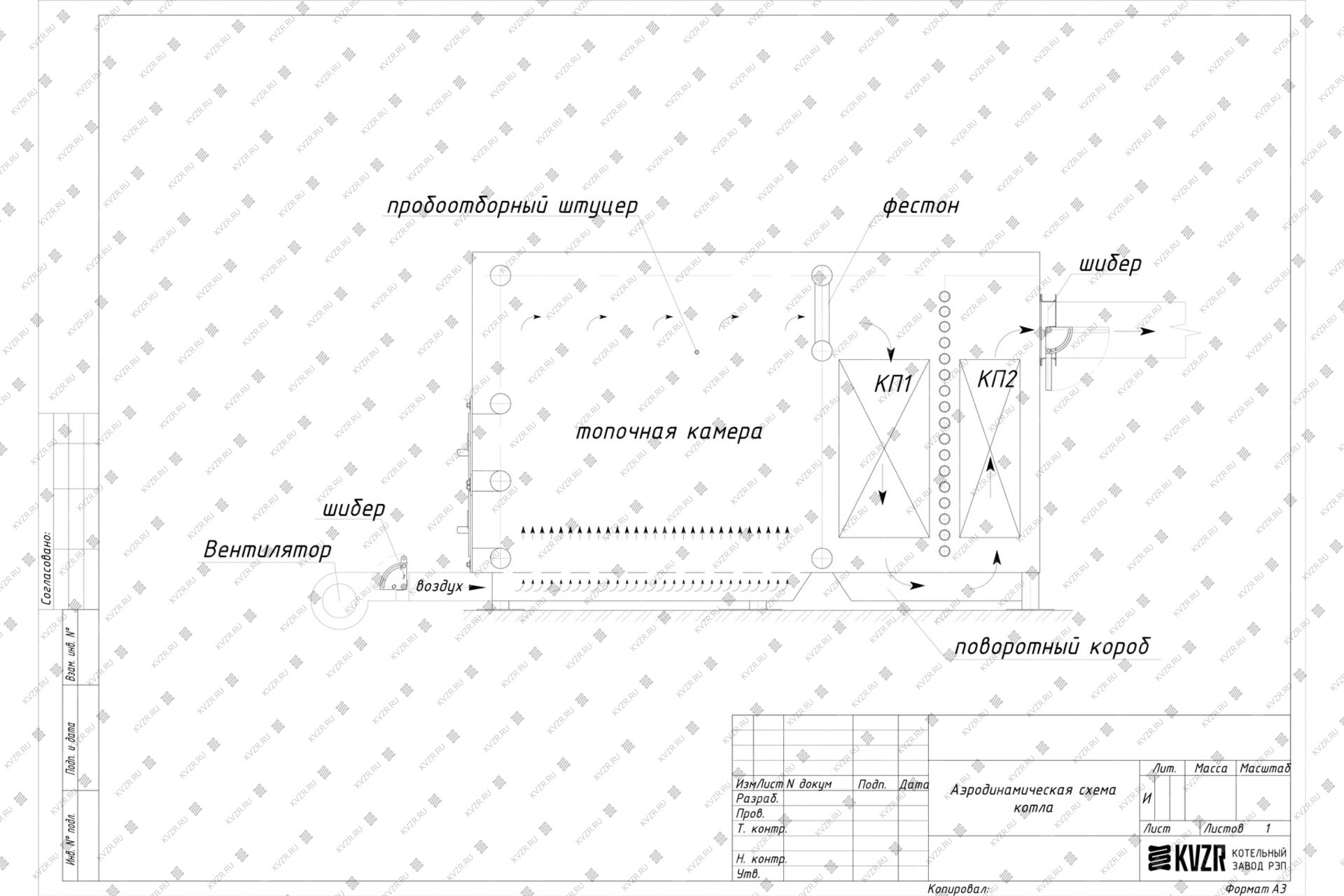 2. Горение: Воздух на горение твердого топлива подается принудительно дутьевым вентилятором. Интенсивность горения регулируется шибером на воздуховоде.