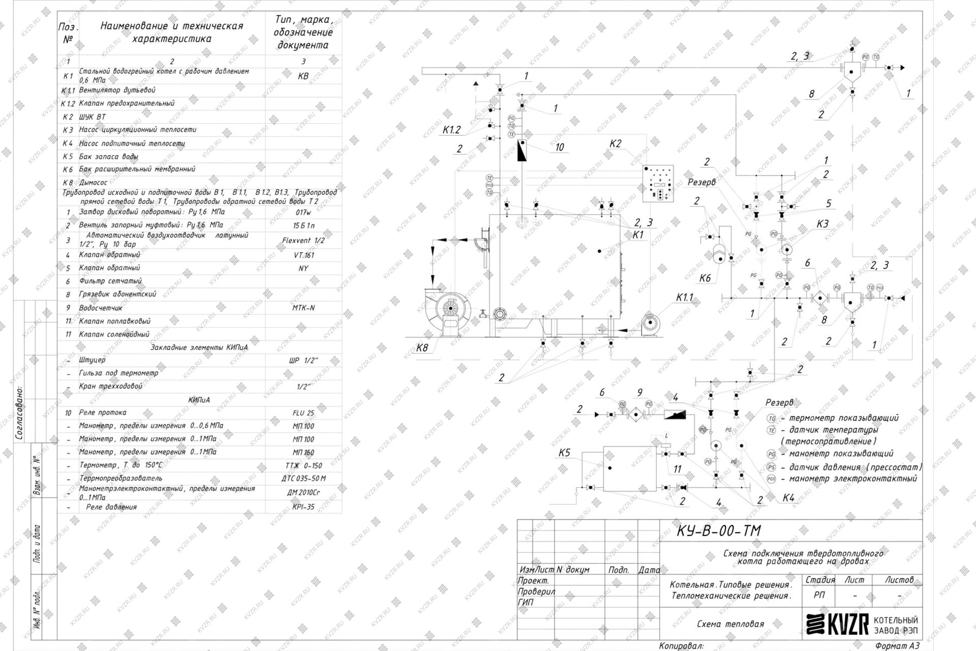 Образец тепловой схемы подключения дровяного дровяного котла 0.6 МВт с большой топкой и вспомогательного оборудования в котельной приведен на данной схеме. При эксплуатации очень важно грамотно осуществить подключение оборудования, установить все контрольно измерительные приборы, для контроля параметров работы котельной и запорную арматуру для оперативного переключения потока теплоносителя при плановой или аварийной остановке оборудования. Данную схему можно использовать как пример для разработки под свой объект или заказать у нас разработку индивидуальной схемы для вашей котельной.