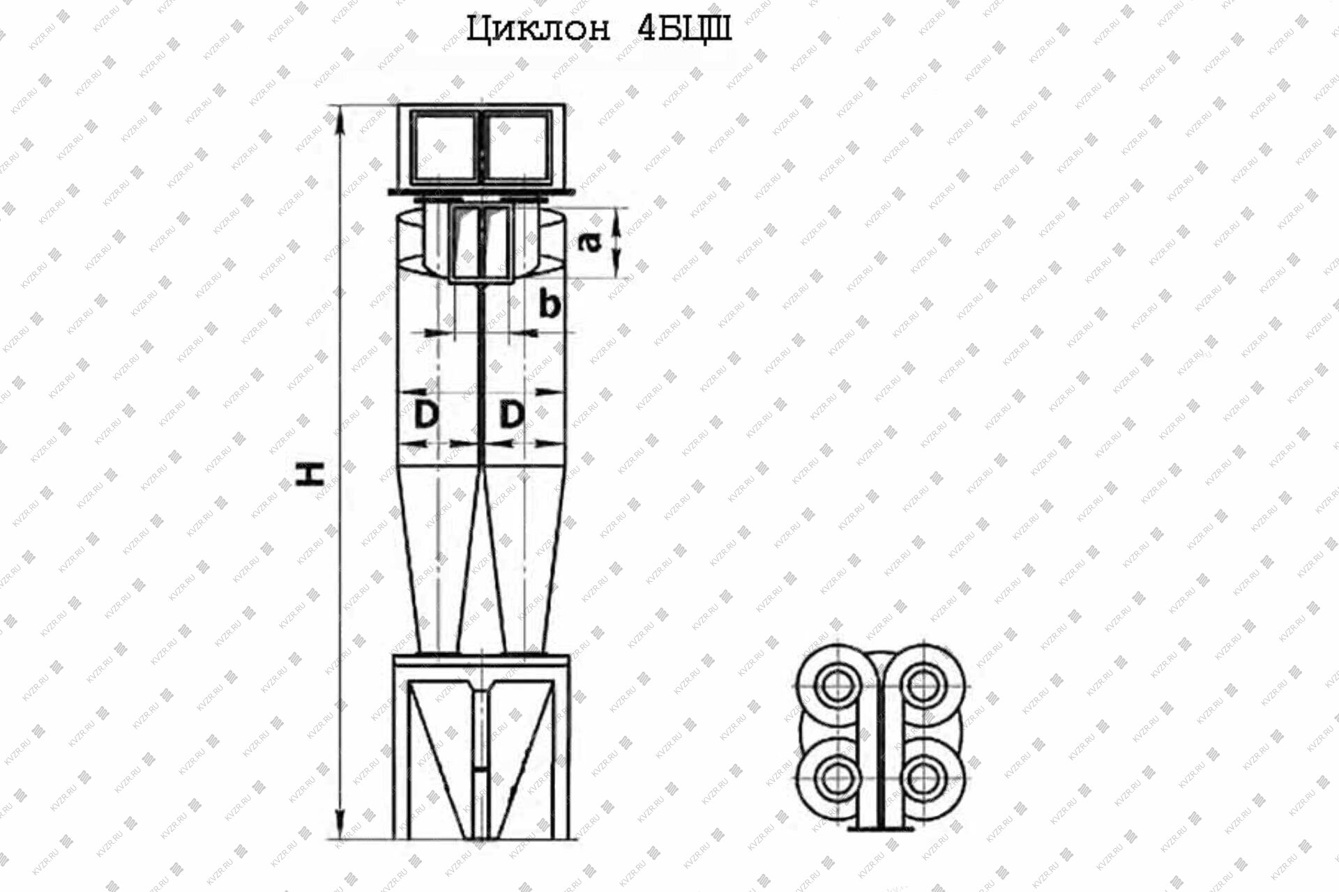 Конструкция циклона для пыли 4БЦШ состоит из четырех аппаратов, два из которых — правого исполнения, а другие два — левого. Камера очищенного газа выполняется в виде призматического коллектора с выходом вбок. Конический бункер со станиной и шлюзовым затвором с приводом (поставляется отдельно). Агрегат может устанавливаться как на всасывании, так и на нагнетании, но в целях продления службы вентилятора рекомендуется устанавливать на всасывающем трактате воздуховода.