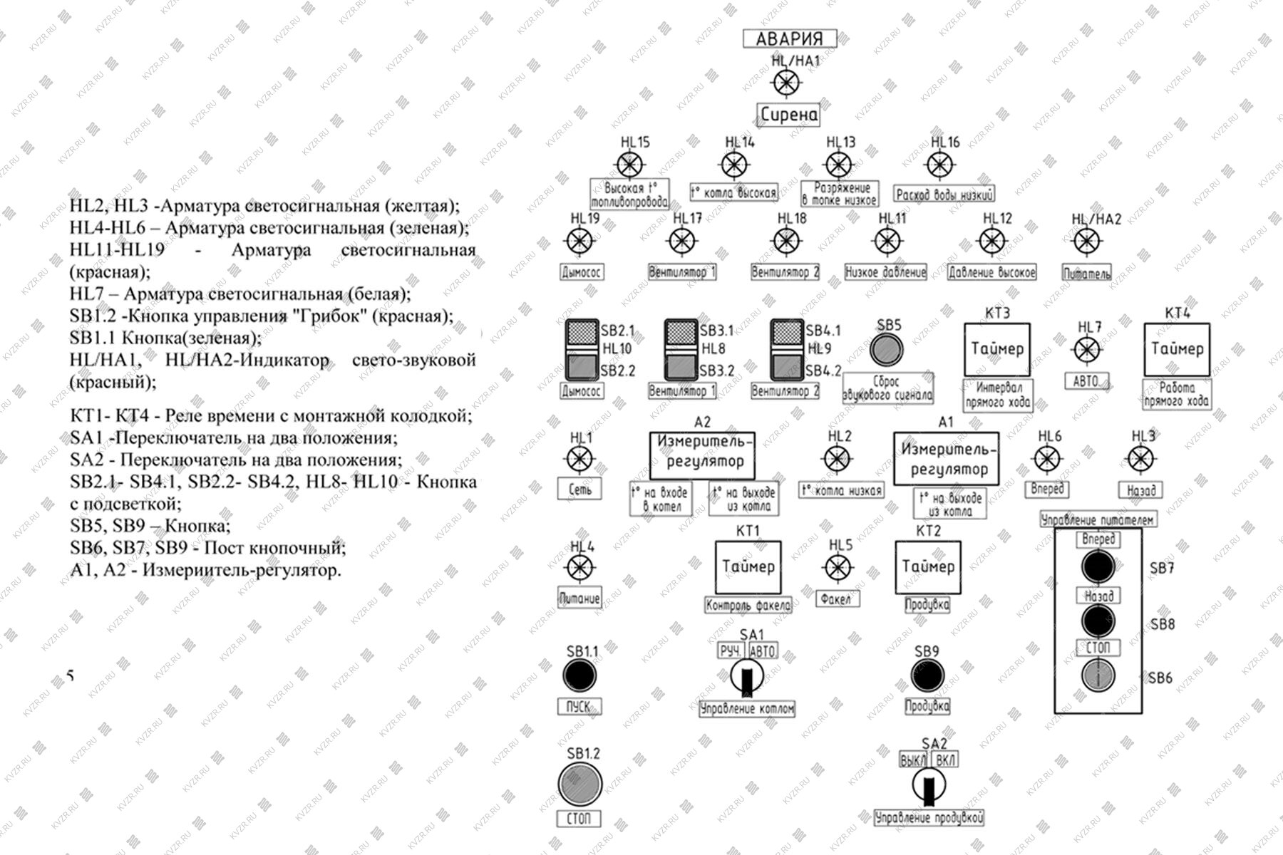 Щит управления котлом на древесных отходах предназначен для предупреждения аварийной обстановки при работе водогрейного котла на опилках со шнековой подачей топлива в топку с помощью световой и звуковой сигнализации, ручного и автоматического управления дутьевым вентилятором первичного воздуха, ручного и автоматического управления шнековым питателем топлива, ручного и автоматического управления шнековым ворошителем, ручного и автоматического управления дымососом, ручного и автоматического управления дутьевым вентилятором вторичного воздуха.